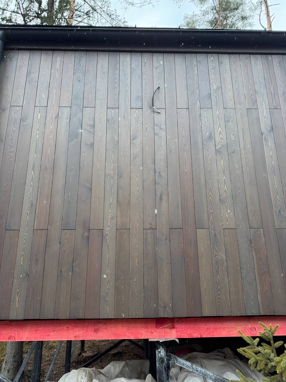 Роскошный планкен из сибирской лиственницы на фасаде модульного дома. Покраска осуществлена немецким маслом BIOFA, а цвет подобран по RAL 7024.
